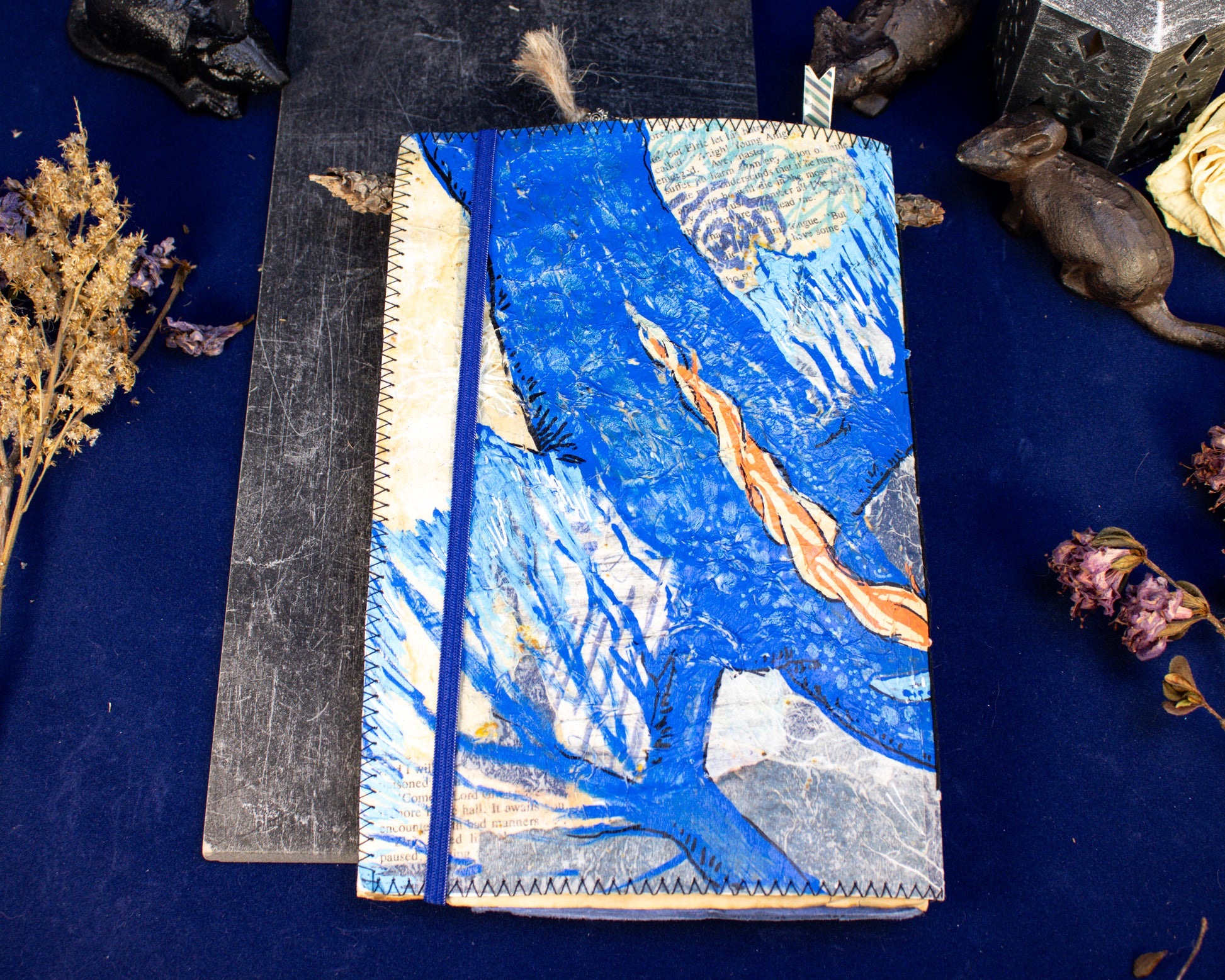 The cover features a striking blue dragon with an orange mane, hand-painted across front and back, and a clear window pocket to display your treasures. An elastic closure keeps your secrets safe while you explore the pages inside, filled with tea-stained sheets, hidden pockets, encounter cards, maps, and more.
