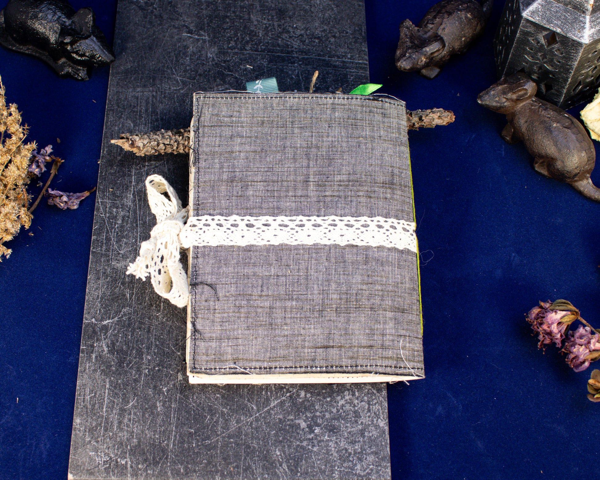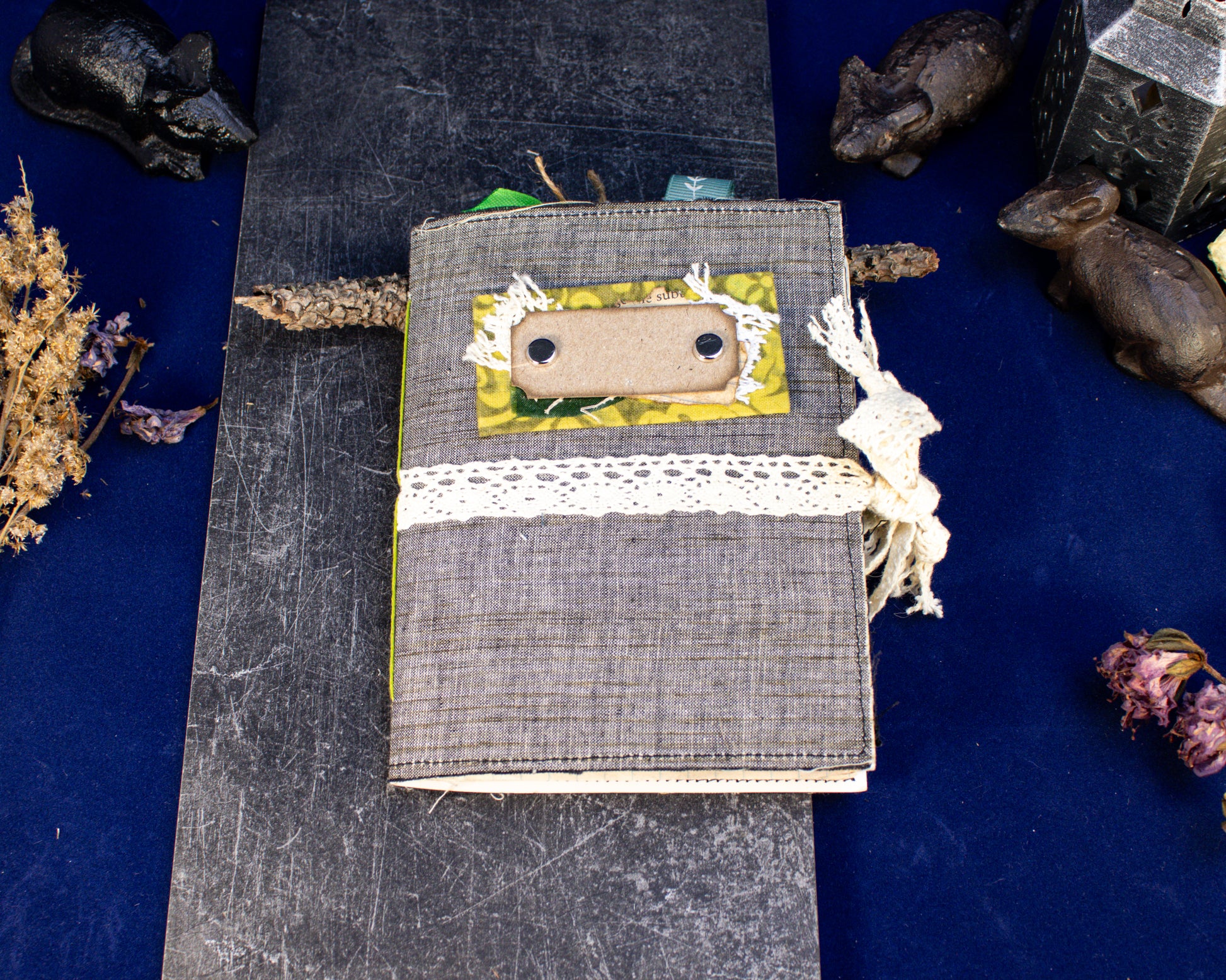Step into the hush of an enchanted morning with the Misty Grove Adventure Journal — a handmade creation wrapped in green and grey fabric and trimmed with delicate lace. Soft to the touch yet sturdy for every journey, this journal feels like it was plucked from a wanderer’s satchel after a misty forest trek.