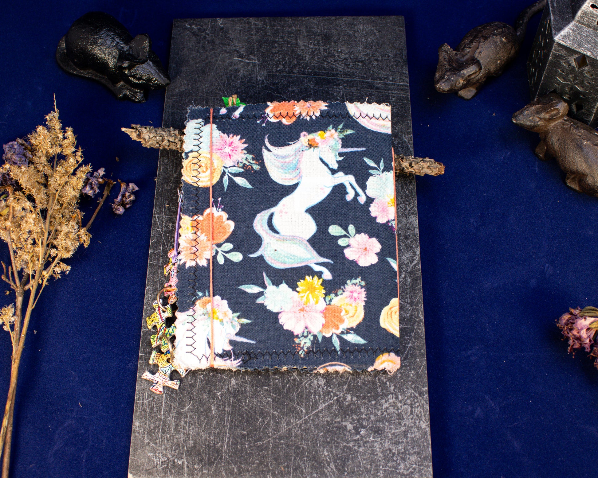Follow the trail of moonlight with the Starlit Unicorn Adventure Journal — a handmade keepsake wrapped in dark blue fabric patterned with unicorns. Every detail feels touched by a bit of stardust, from the tea-stained pages to the hidden pockets, encounter cards, and maps tucked within.